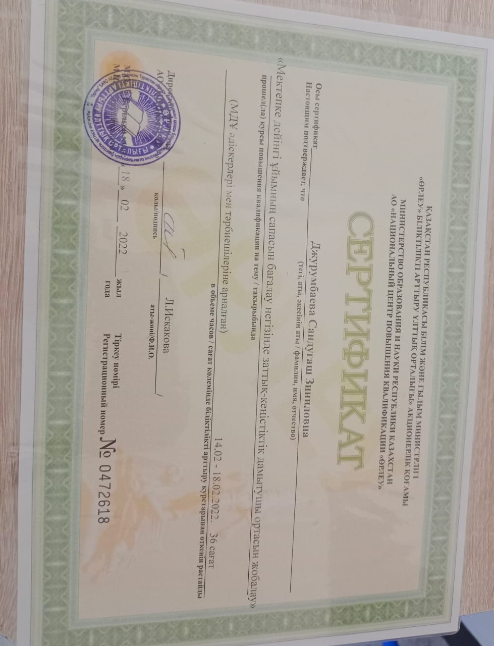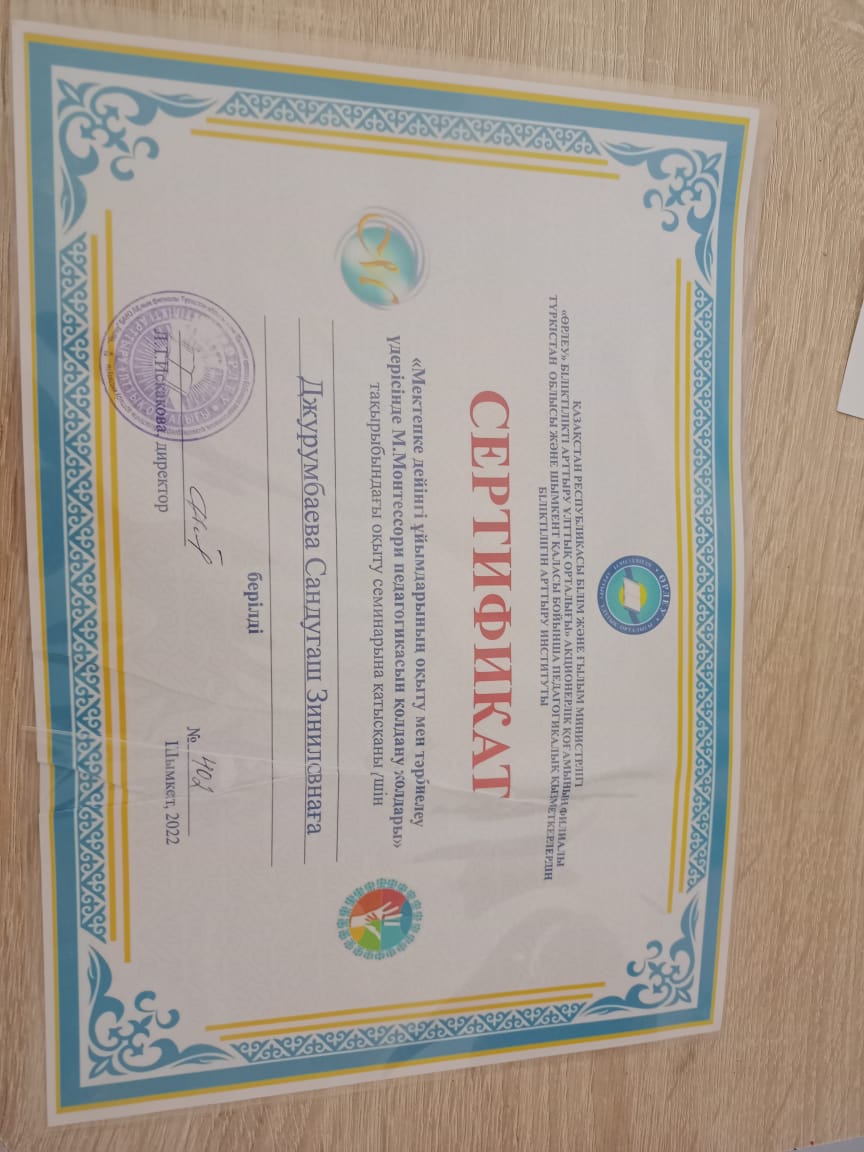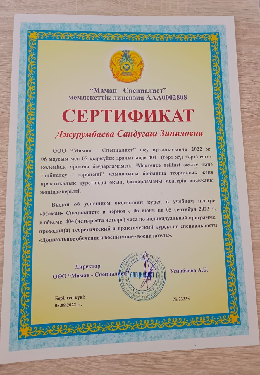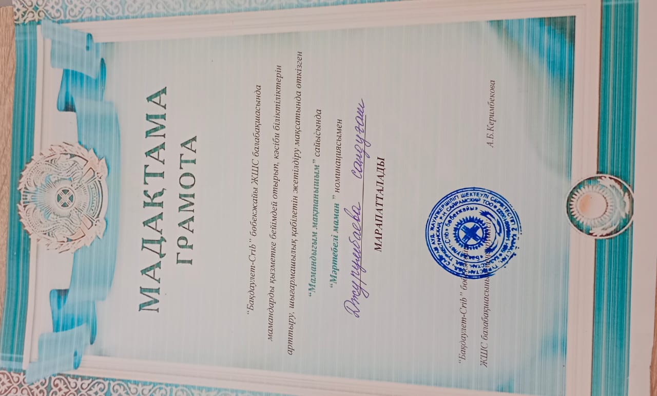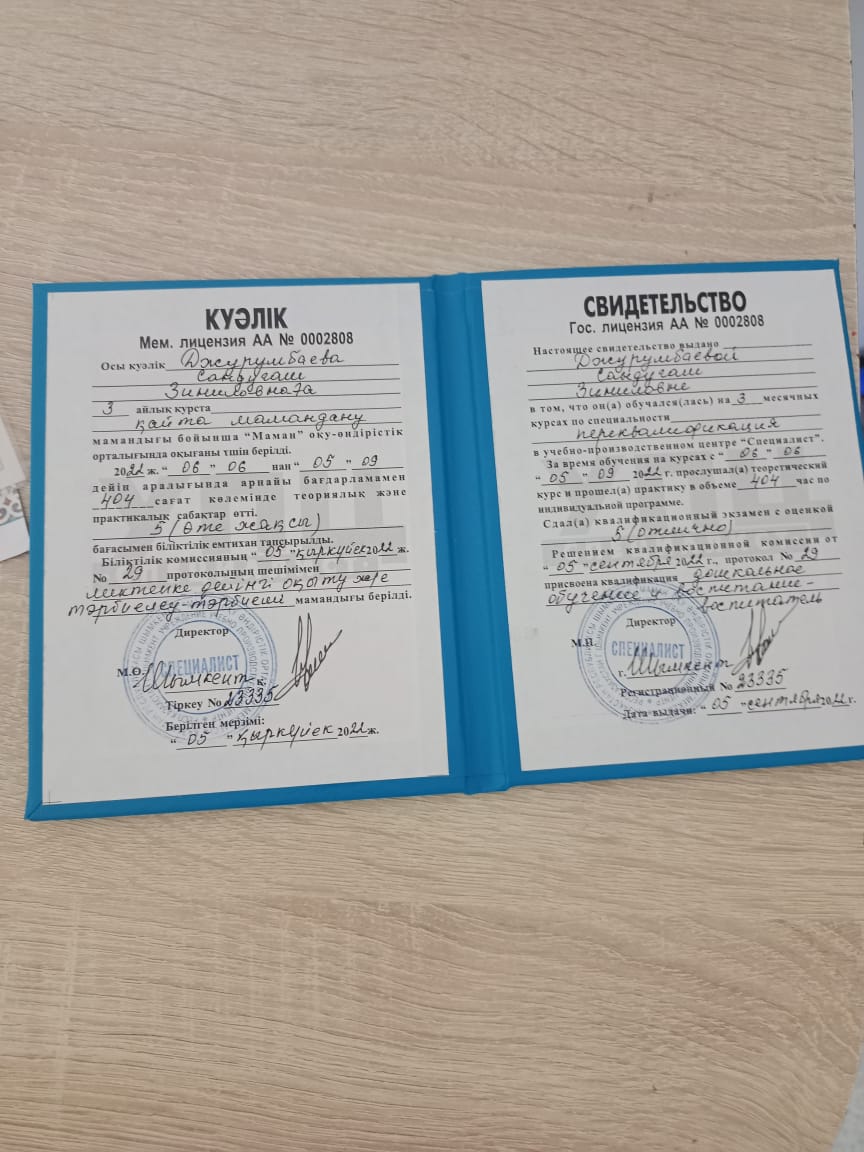 Балабақша тәрбиешісі. Еңбек өтілі - 5 жыл. Білімі: Жоғары. Бітірген оқу орны: Қыздар Педогогика. Институты. Мамандығы: Бастауыш сынып әдістемесі мен педагогикасы.