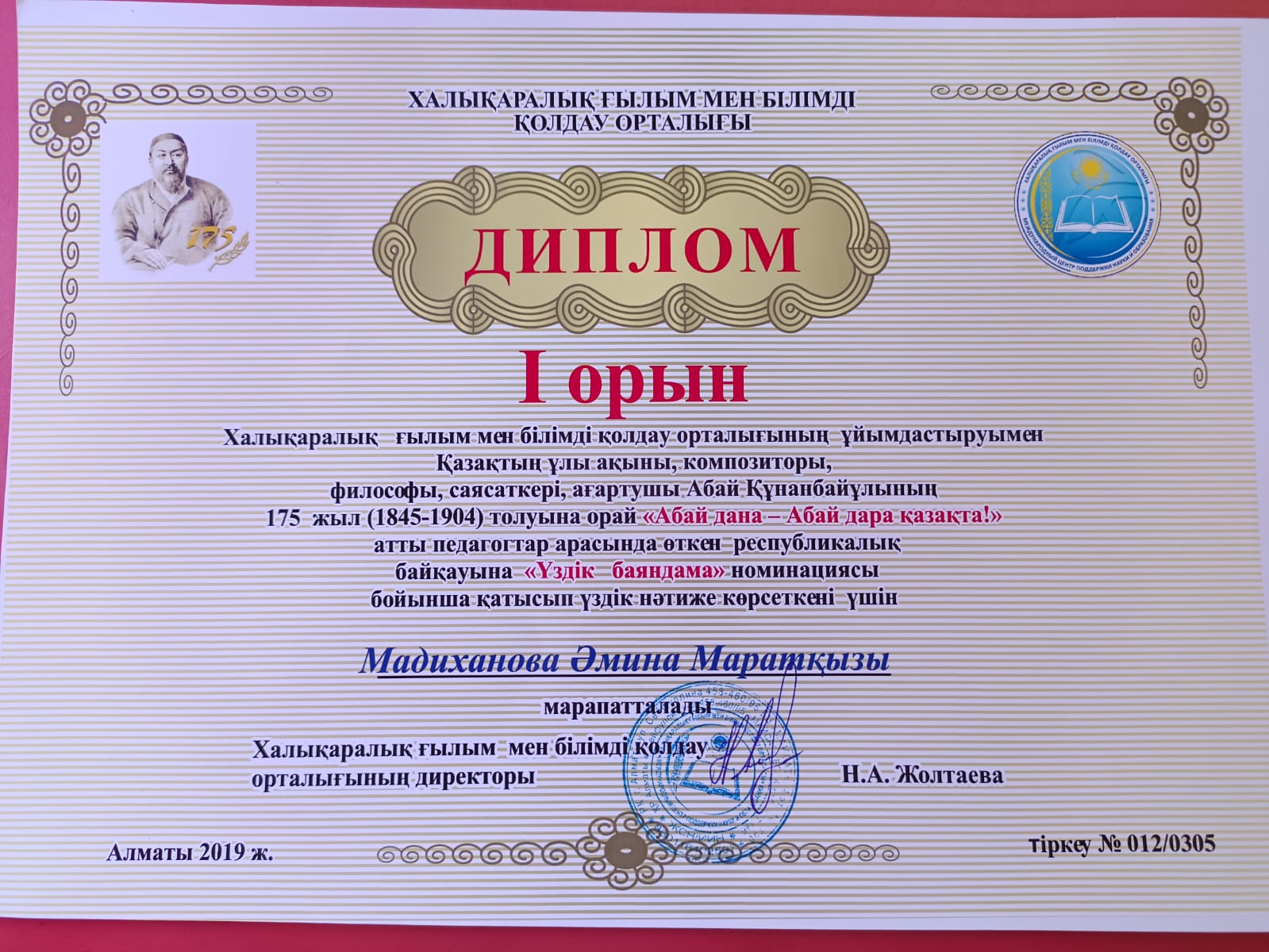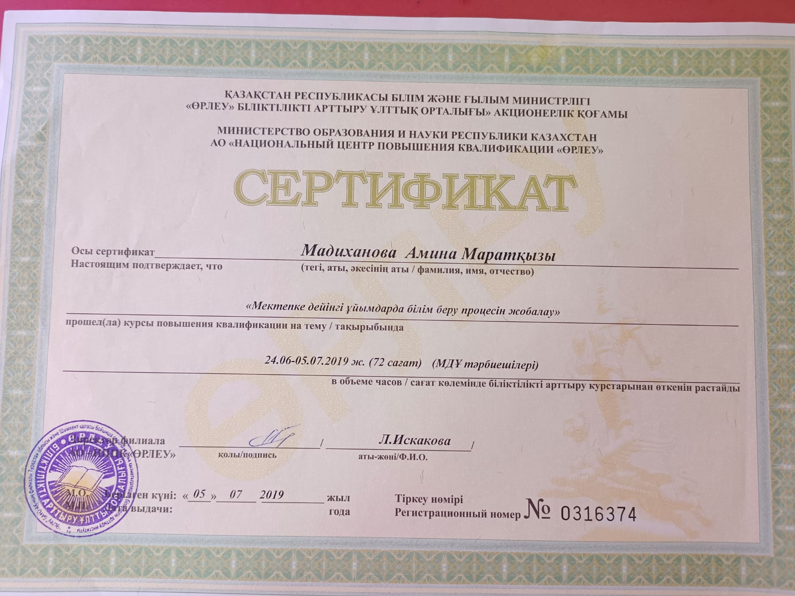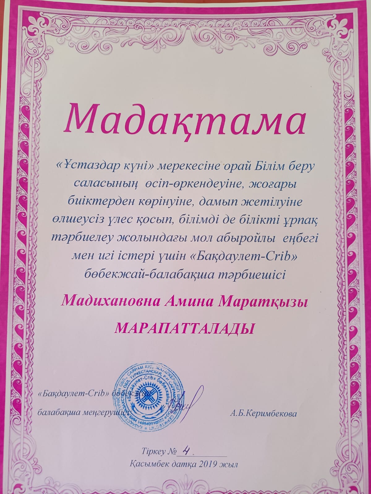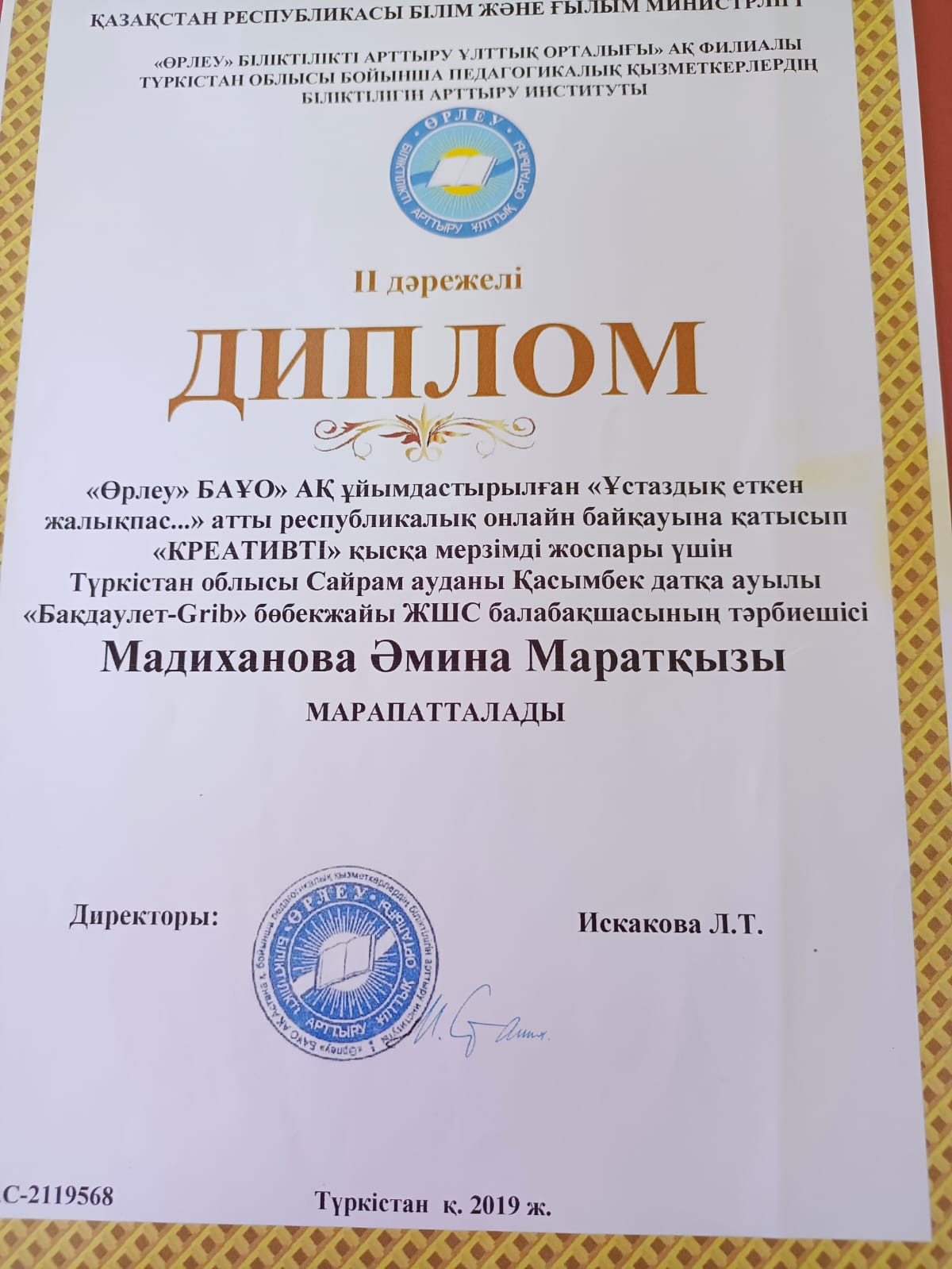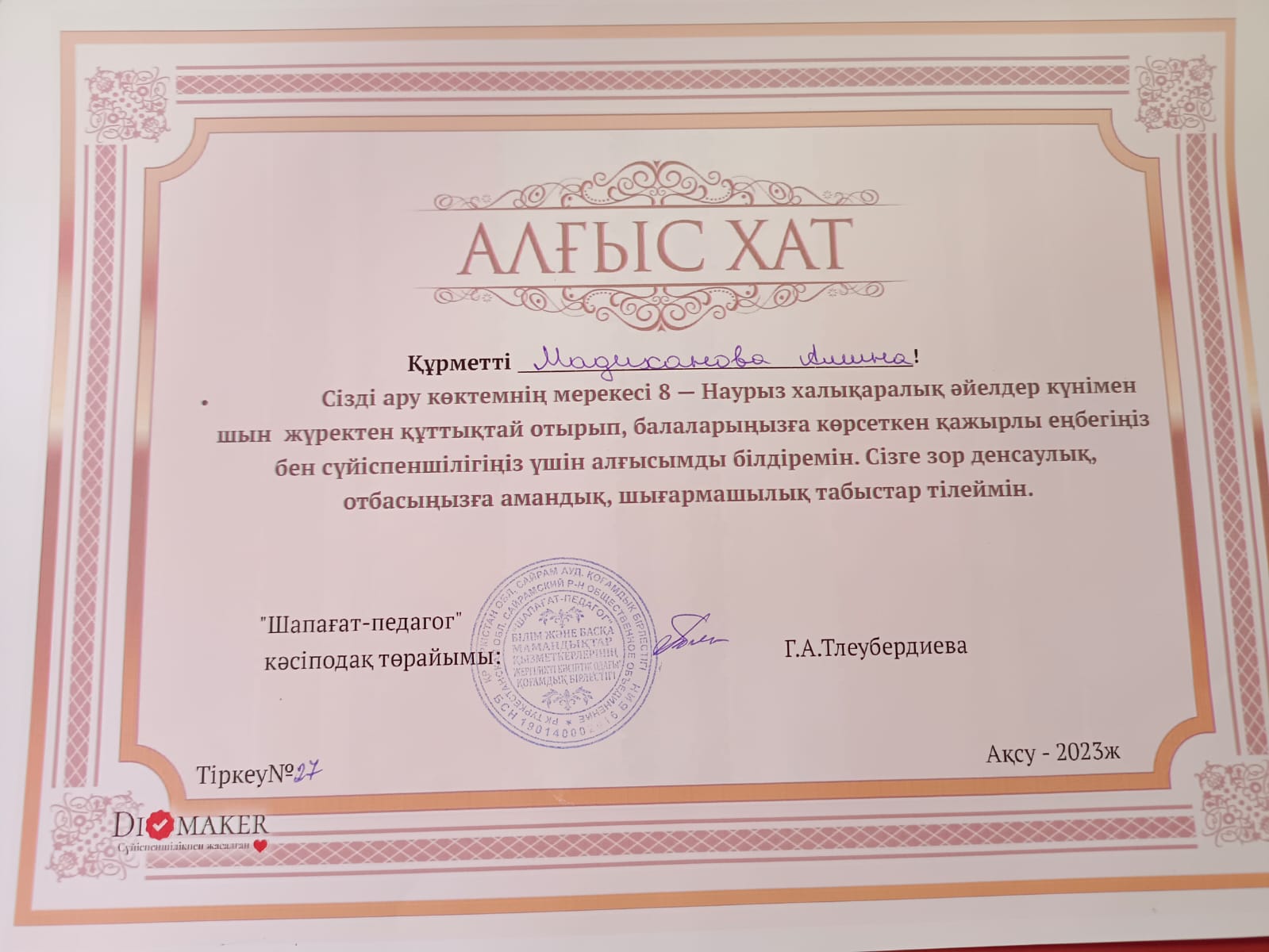 Балабақша тәрбиешісі. Еңбек өтілі 1-жыл Білімі: Орта Бітірген оқу орны: Болашақ коледж. Мектепке дейінгі тәрбие.