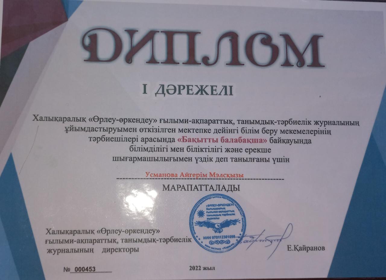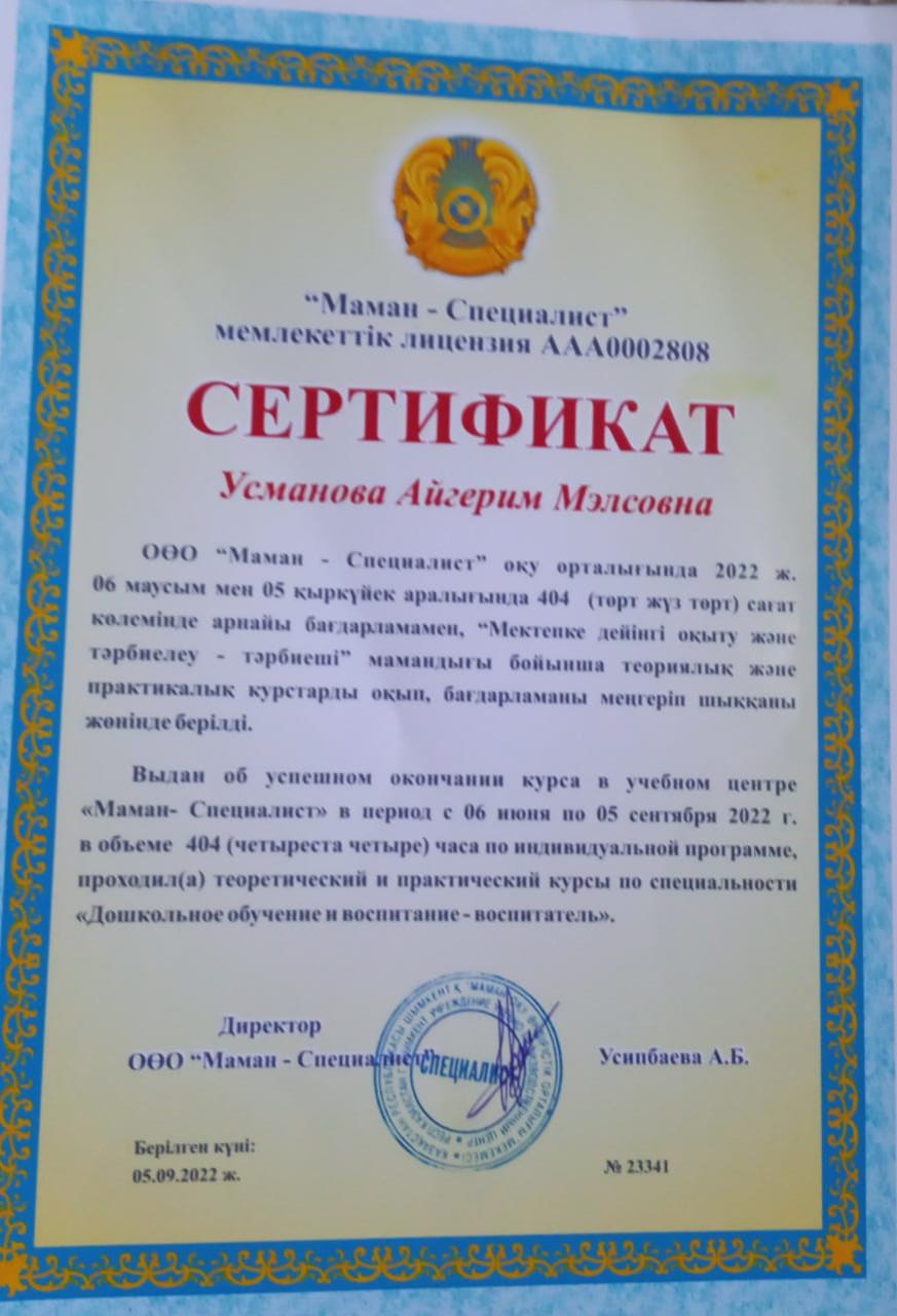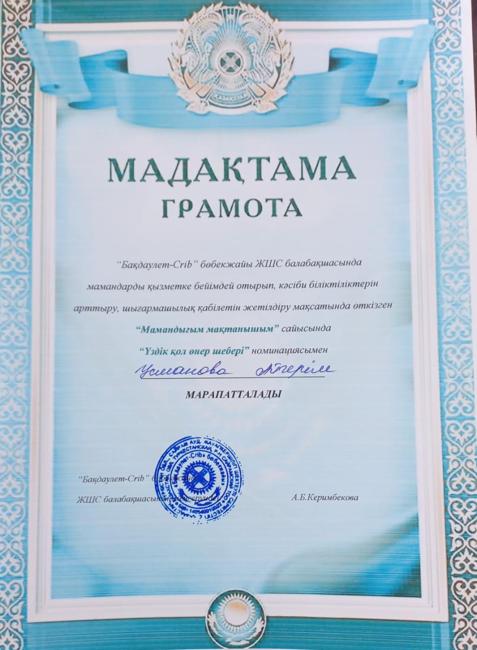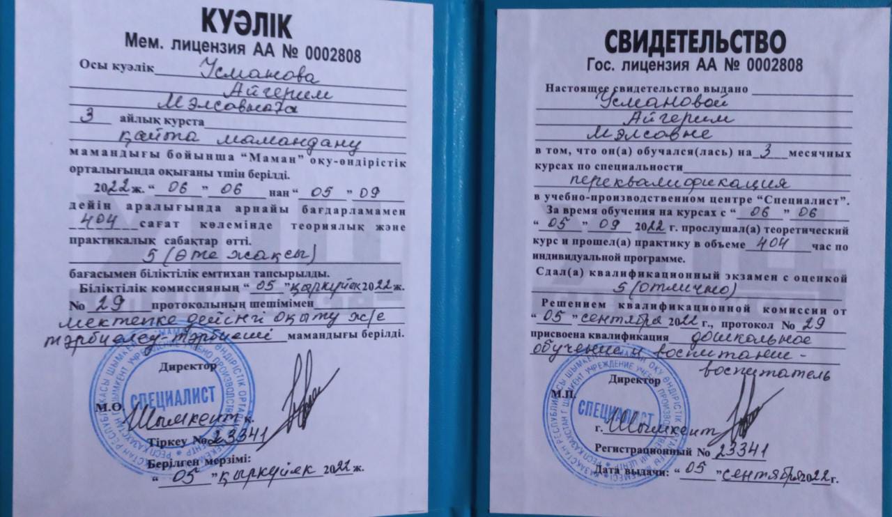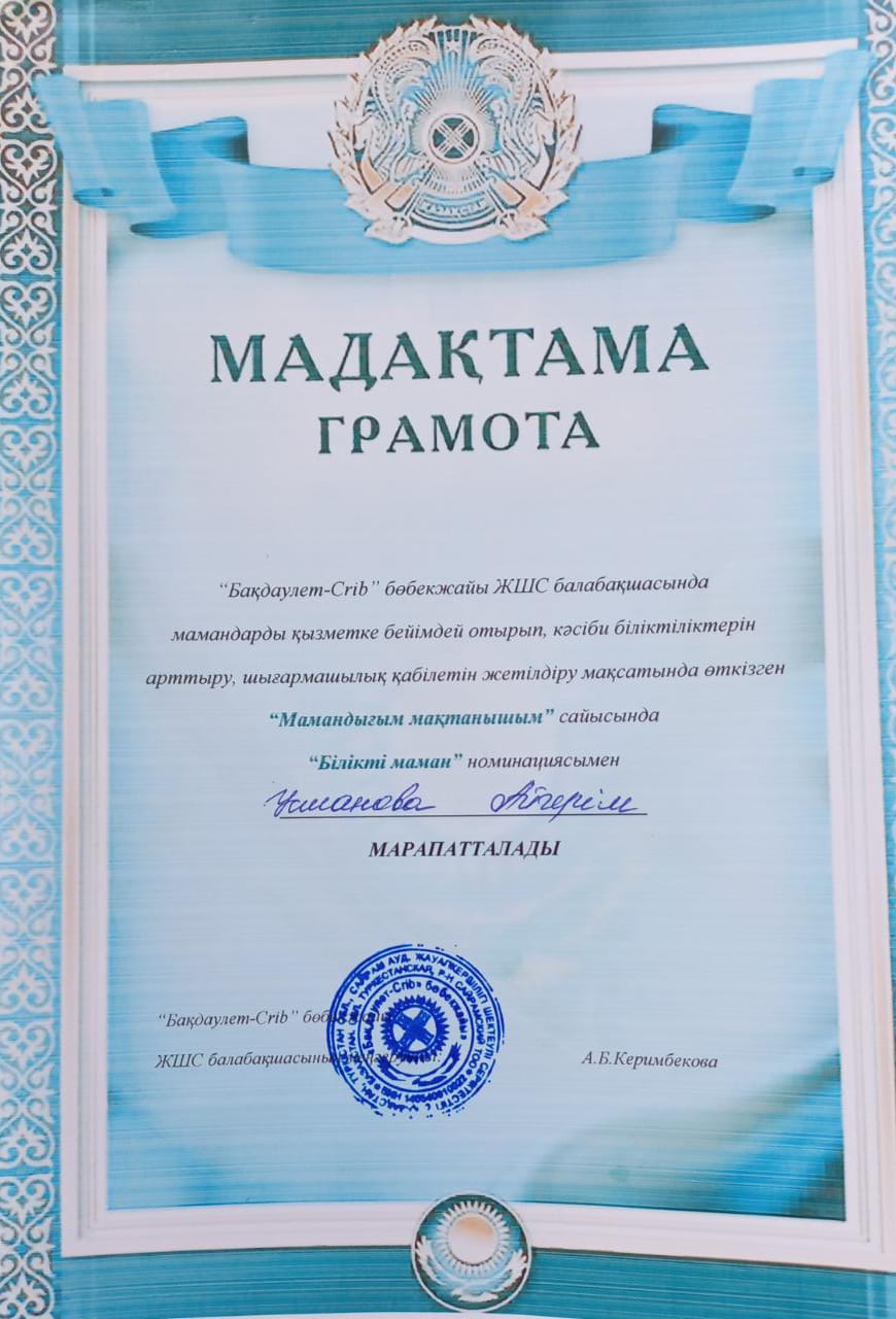Балабақша тәрбиешісі Еңбек өтілі: 5жыл Білімі: Жоғары Бітірген оқу орны: "Бастауыш оқытудың педогогикасы мен әдістемесі"
