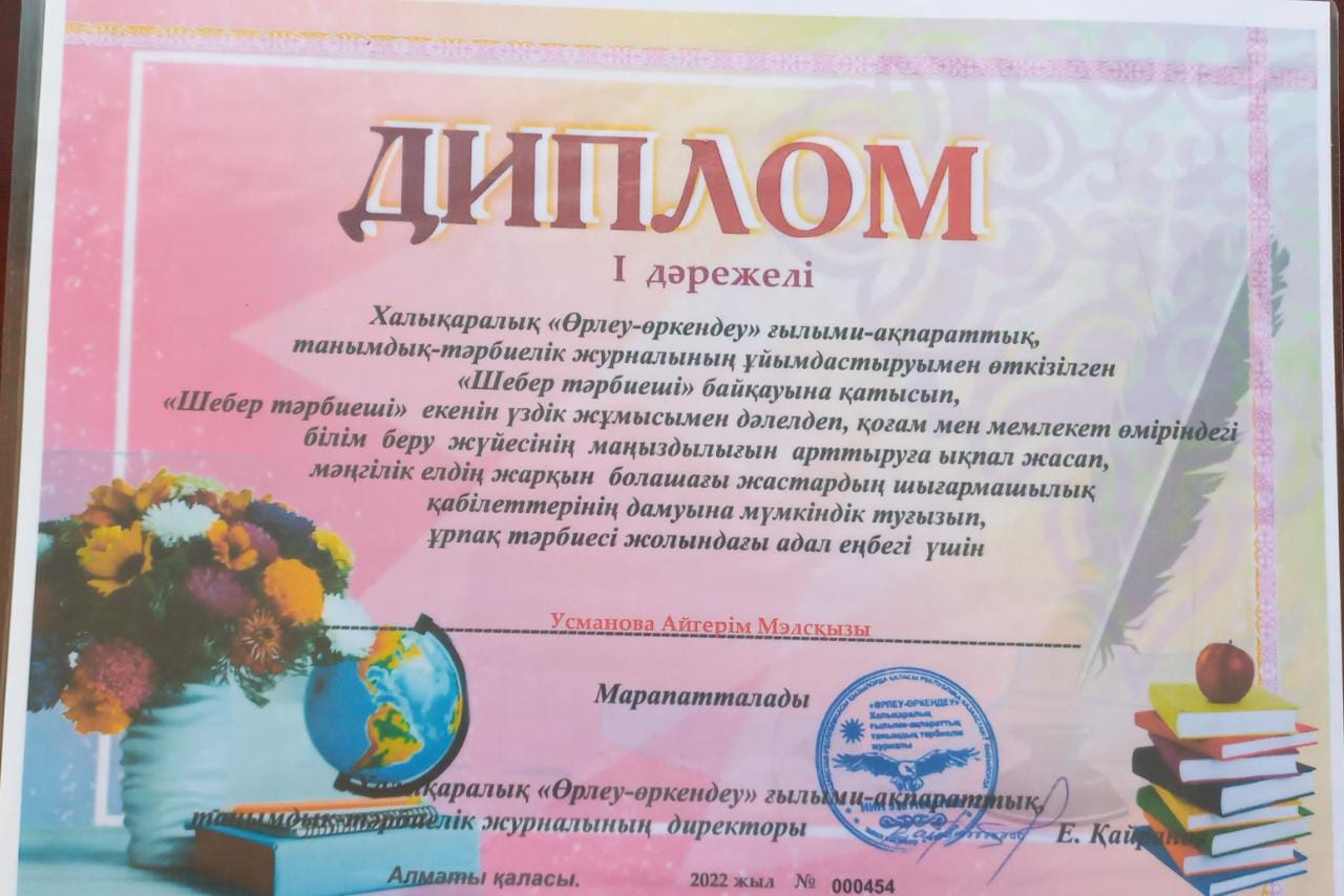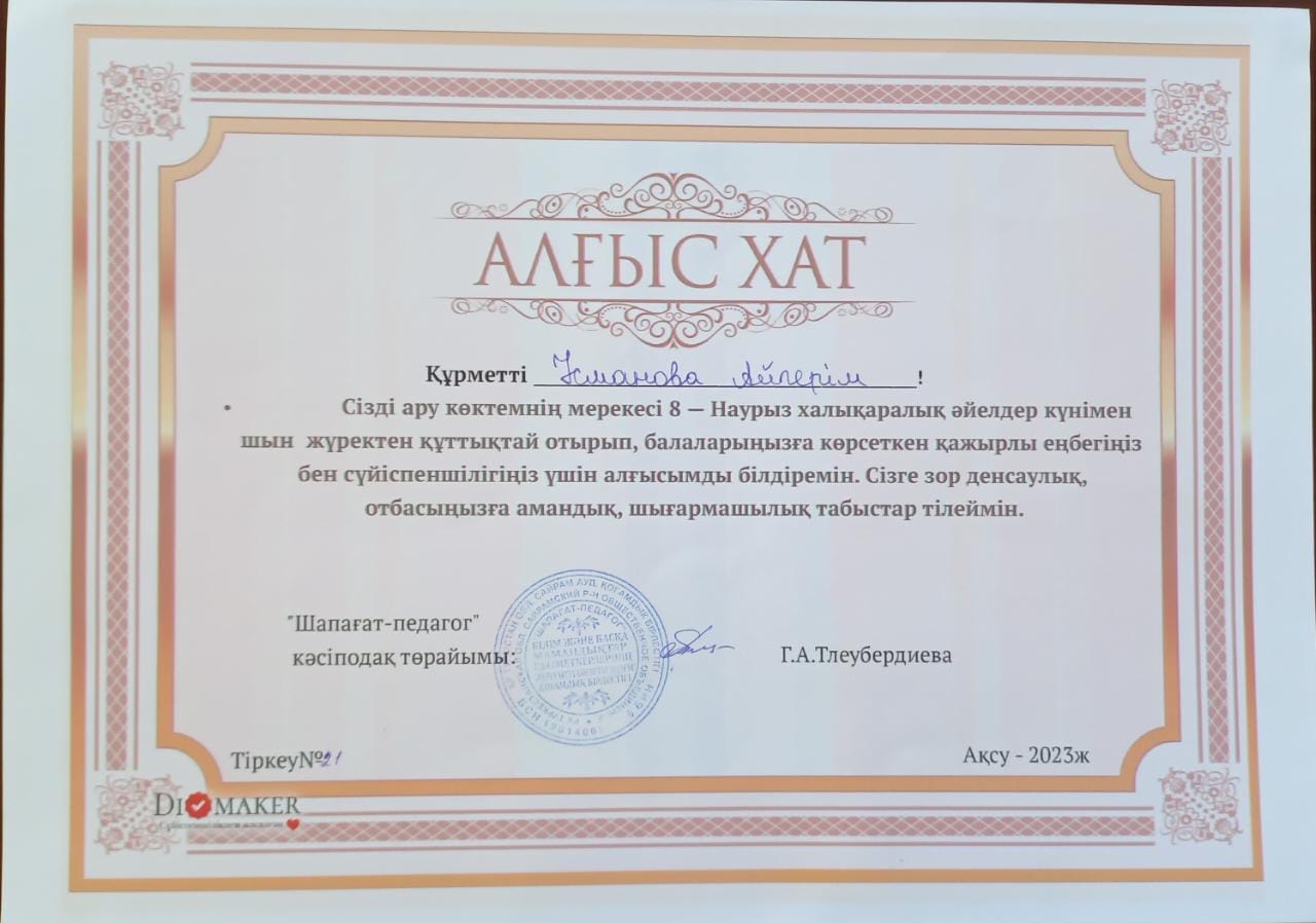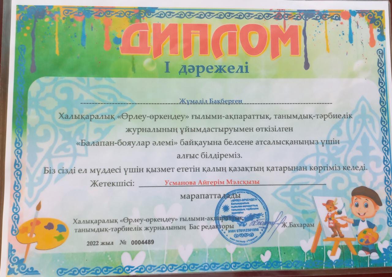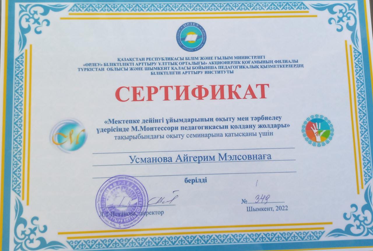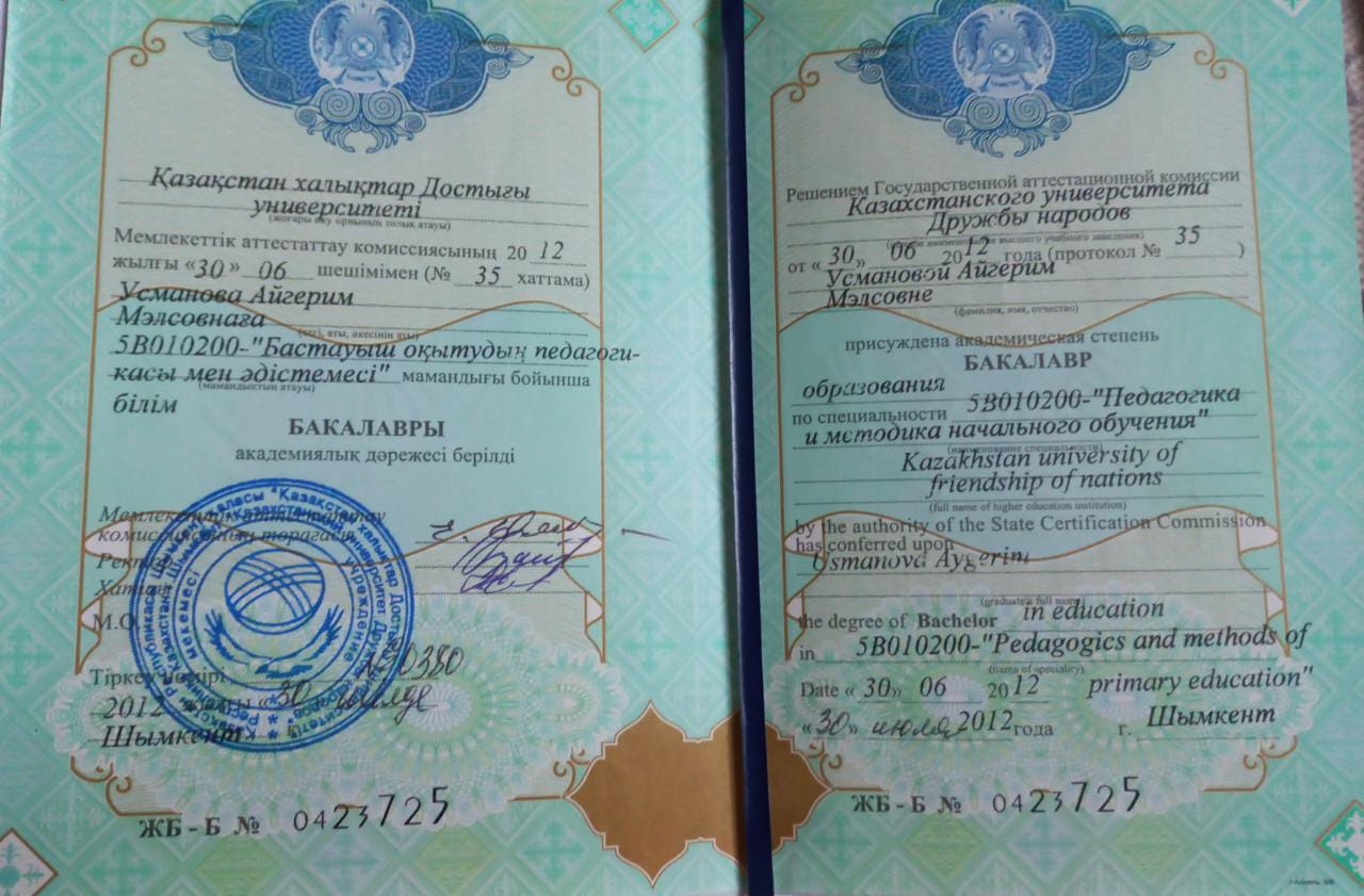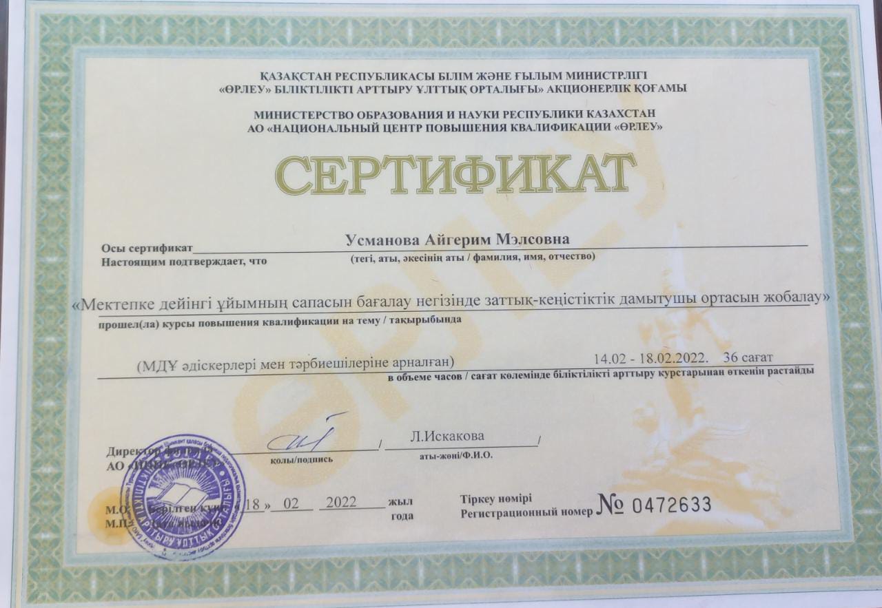 Балабақша тәрбиешісі Еңбек өтілі: 5жыл Білімі: Жоғары Бітірген оқу орны: "Бастауыш оқытудың педогогикасы мен әдістемесі"